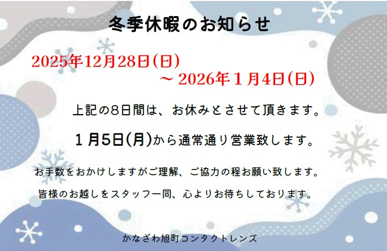 年末年始期間中は下記日程にて当店、隣接眼科ともに休業となります。