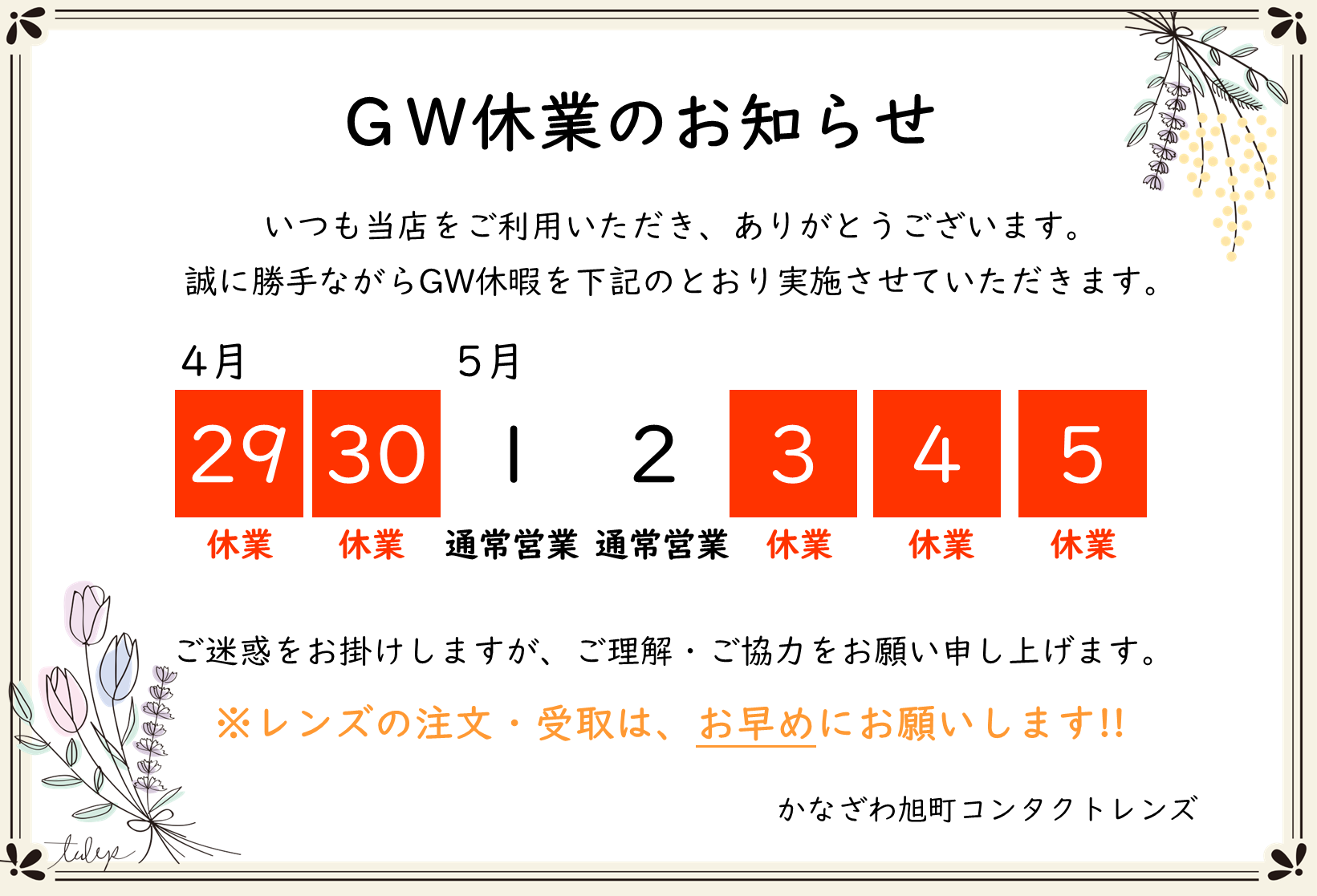 GW期間中は下記日程にて当店、隣接眼科ともに休業となります。